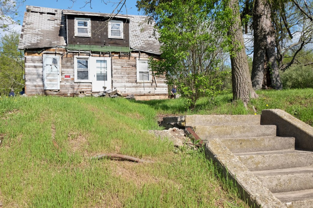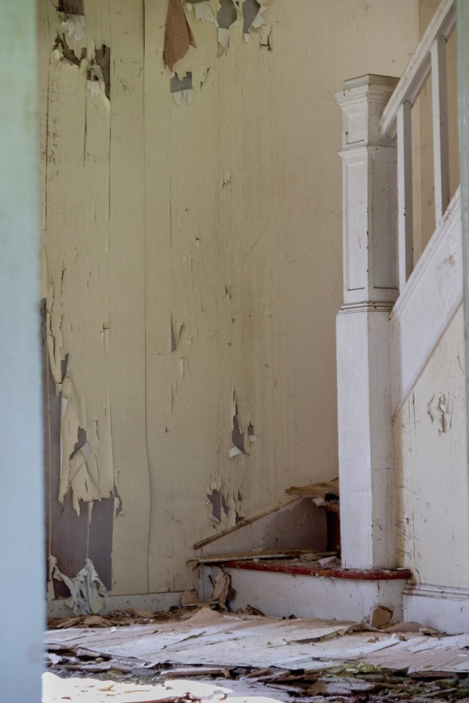 I’ve watched the house deteriorate over the years – the porch collapsed and was later carted away; the roof partially caved in at the rear; and an unidentified wood-frame outbuilding evidently blew over in a recent storm. Much of its ¾-inch thick pale blue-painted cedar siding was recently removed exposing 5-inch wide solid pine sheathing (both flush boards and edgeand- center-beaded). Part of the foundation is rock-faced concrete block and part is smooth faced block suggesting construction in two phases. A concrete walkway with steps leading from what is now the highway suggests that they once served a neighborhood of walkers and slower paced cars. This was a suburban style property with a detached two-car garage in the backyard.